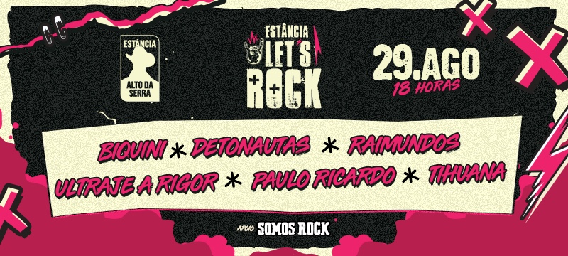 A Estância Alto da Serra recebe, no dia 29 de agosto, a partir das 18h, o festival Estância Let’s Rock, uma celebração do rock nacional reunindo grandes nomes que marcaram gerações. O evento traz ao palco Biquini, Detonautas, Raimundos, Ultraje a Rigor, Paulo Ricardo e Tihuana, em uma noite repleta de clássicos, energia e atitude. Com estrutura completa e atmosfera única, o Estância Let’s Rock promete uma experiência intensa para os fãs do gênero, reafirmando a Estância Alto da Serra como um dos principais palcos de grandes encontros do rock brasileiro. Rock, nostalgia e muita atitude em uma noite imperdível. 🤘